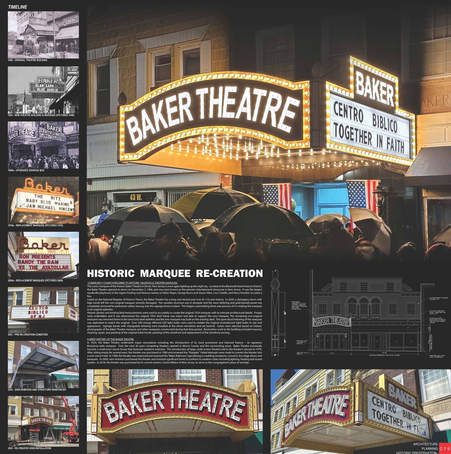 Listed on the National Register of Historic Places, the Baker Theatre has a long and storied past over its 116-year history. In 2020, a damaging storm with high winds left the non-original marquee severely damaged. The wooden structure was in extreme disrepair and the neon lettering and gold-backed panel was completely torn off leaving only the signage boxes in place. This began a painstaking three year process of re-creating the marquee to its original splendor.